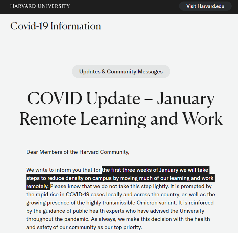 哈佛通知所有学生及教职工,学校将在 1 月的前三周实行远程教学和办公,以降低校园内的人员密集程度,减少病毒传播风险。只有先前获准留在校园内的学生,或获学校批准的学生才能在这三周内返回校园。