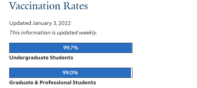 与此同时,还有多所大学也出现了病例激增的情况,而这些学校的疫苗接种率其实都不低,甚至确诊的病例中有“非常高的比例”是在完全接种了疫苗。比如:康奈尔大学学生的整体疫苗接种率为97%;普林斯顿大学的疫苗接种情况为本科生 99% 的疫苗完全接种率,研究生为 98%,教职员工为 96%;耶鲁大学的学生疫苗接种情况也超过了 99%。