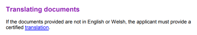 2)如果文件不是英语或威尔士语,则申请人必须提供由被认可的翻译公司翻译的文件。