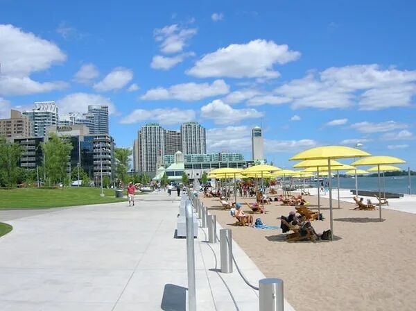 滨水公园位于多伦多的内港,这里有沙滩、黄色遮阳伞和五颜六色的Muskoka椅子。