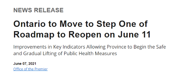 此前,安省将解封日期定在6月14日,以进入三阶段解封计划的第一阶段,但现在已经将日期提前,改在了周五凌晨0点01分开始生效。
