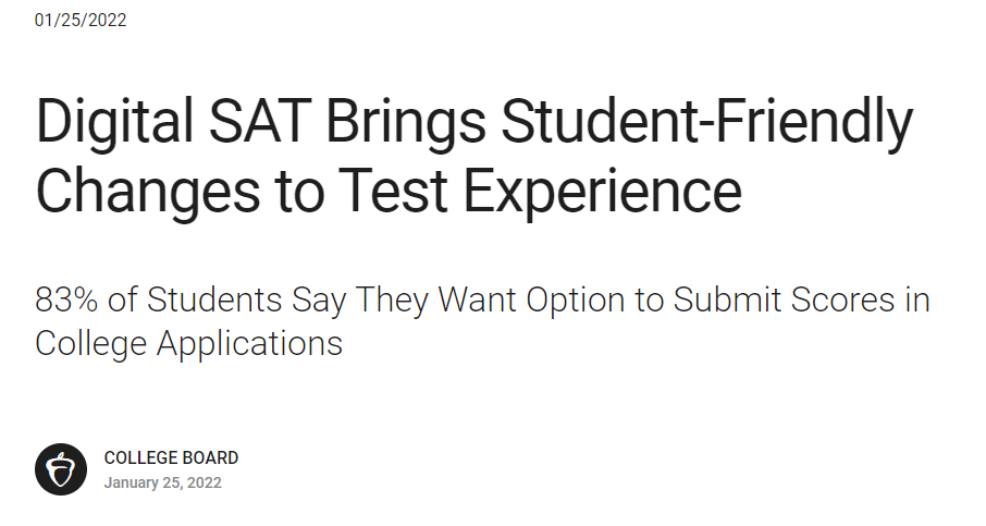 一年前,大学理事会宣布取消了SAT科目考试和论文考试。传统上,一般大型的公立大学都把提供考试成绩作为可选项,但大多数申请者还是提交了标准化考试成绩。