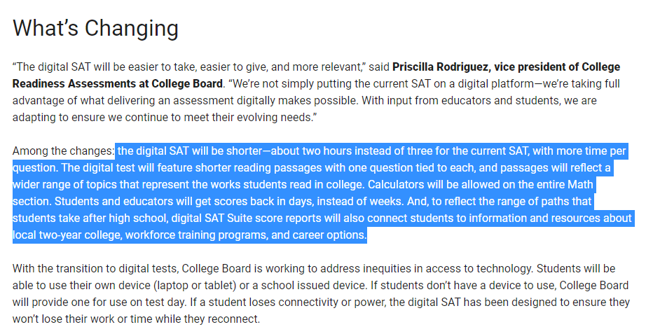 除了过渡到数字考试外,大学理事会还将允许在数学部分使用计算器,缩短阅读段落并提供主题更广泛的文章。
