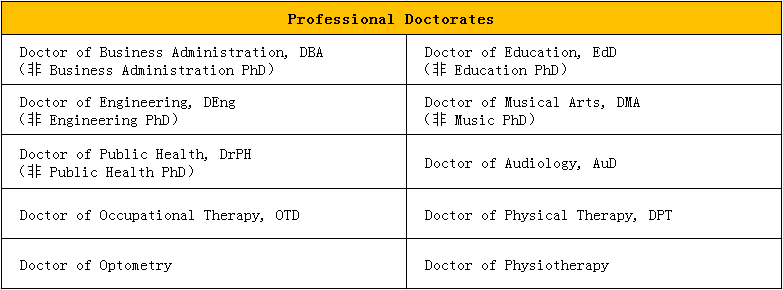 法学院是Juris Doctor, JD、医学院是Doctor of Medicine, MD、牙医学院是Doctor of Dental Medicine, DMD或Doctor of Dental Surgery, DDS、药学院是Doctor of Pharmacy, PharmD、兽医学院是Doctor of Veterinary Medicine, DVM。