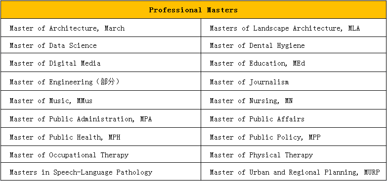 下面我们列出了一些常见的除了商学院、管理学院、或法学院的Professional Masters和Doctorates给同学们参考: