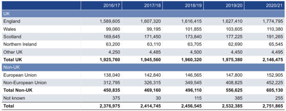 正如我们在上表中看到的,随着时间的推移,这种平衡正在发生变化,越来越多的学生从欧盟以外的地方来到英国。在 2016/17 学年,来自欧盟国家的学生占英国大学所有外国招生人数的 31%;截至 2020/21 年,该百分比已降至 25%。