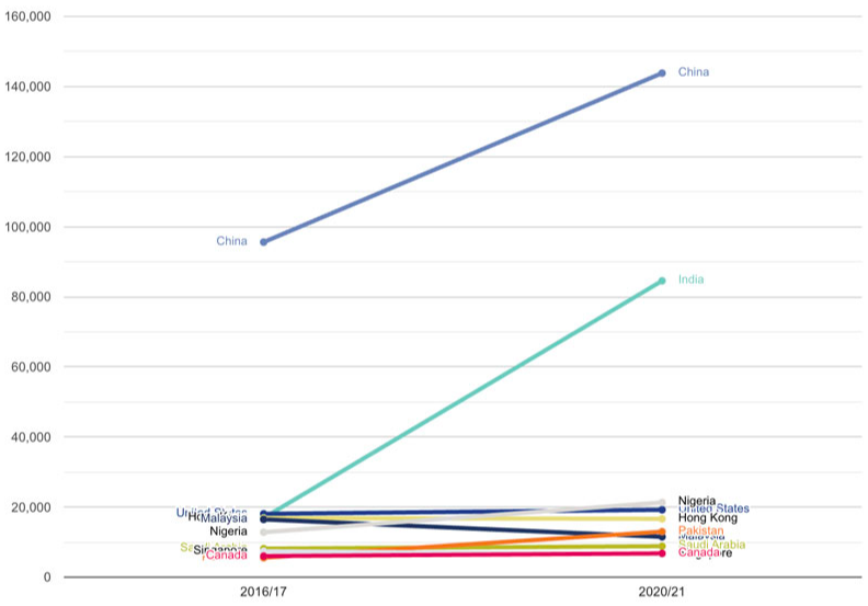 2020/21 学年,32% 的非欧盟学生来自中国。注册的新生中,有 9.9 万人来自中国大陆,比疫情前的 2019/20 学年减少 5,080 人,环比下降 4.9%,这是自 2016 年以来,该数字首次出现下滑。但新生人数仍高于 2018/19 学年的 8.7 万人。此外,在 2016/17 至 2020/21 的五年期间,来自中国的学生人数增加了 48,225 人或 50%;