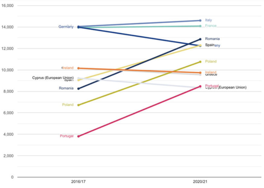 下图显示了欧盟的主要输出市场,并显示虽然相对持平,但意大利和法国仍然是英国高等教育在欧洲的主要市场。尽管近年来德国的入学人数有所下降,但这些损失已被葡萄牙、波兰、罗马尼亚和西班牙越来越多的人数所抵消(甚至更多)。