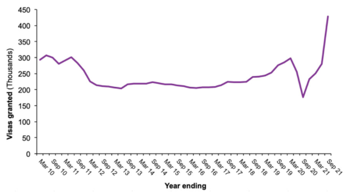截至 2021 年 9 月的年度,英国移民官员共签发了 428,428 份学习签证,较截至 2020 年 9 月的年度增加 143%,较截至 2019 年 9 月的年度增加 55%。