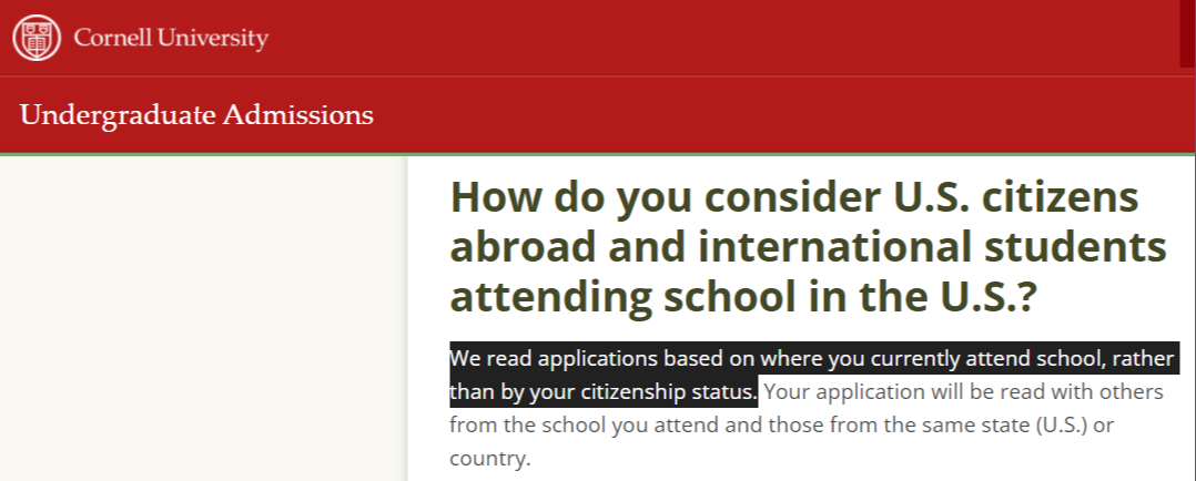 一方面,部分美国院校明确指出,在美国读高中的非美籍学生,将会被当成美国学生来对待。如康奈尔大学官网上关于”您是如何看待在国外的美国公民和在美国上学的国际学生?”问题下,康奈尔明确表示:学校会根据申请者上学的地点而非国籍来审核申请。