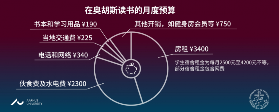 根据奥胡斯大学(Aarhus University)国际中心的统计,留学生的平均月度花销如下: