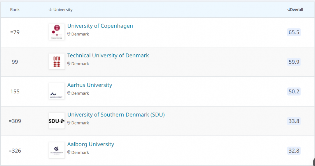 分享一下2022QS世界大学排行榜上丹麦几所大学的排名,这几所大学也是留学生申请数量较多的大学。