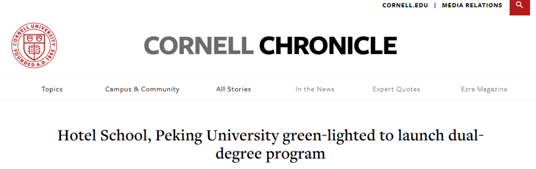 为了加强跨越政治和文化差异的全球学术联系,康奈尔大学宣布批准康奈尔大学庄臣商学院酒店管理学院和中国北京大学光华管理学院之间的国际双学位课程。