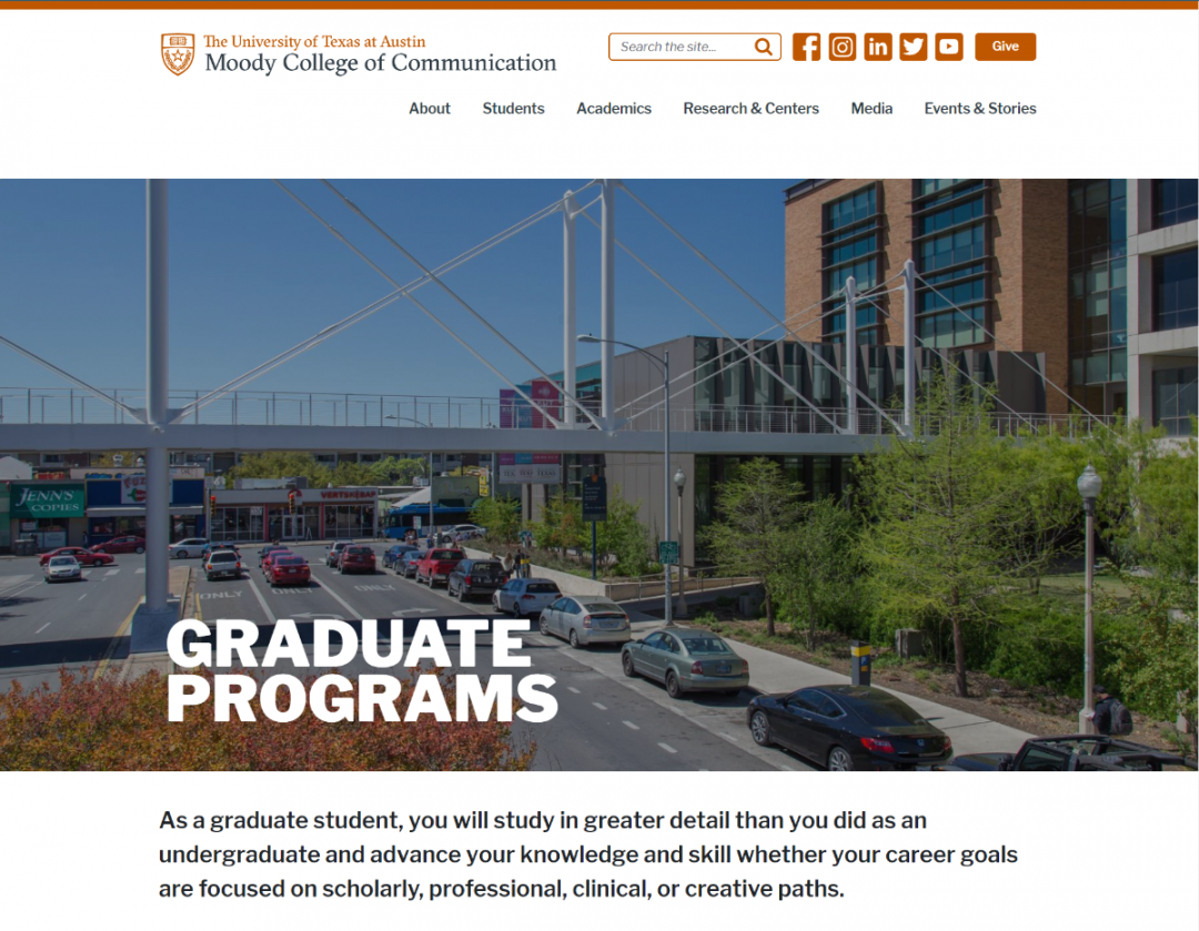 Moody传播学院相信多元化、有才华的人以及他们通过沟通改变世界的集体力量。本科生和研究生人数接近5000人,致力于让学生在掌握广告、传播与传播学、新闻与媒体、公共关系、广播电视电影以及言语、语言与听力科学的基础上追求创新。