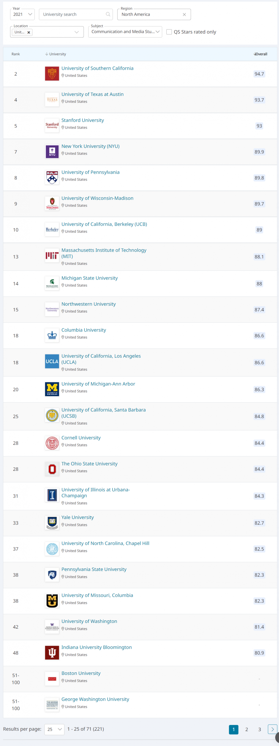 这里我们以2021年QS美国传媒类院校排名榜单为参考,为大家介绍五所知名高校的传媒学院,以及他们开设的硕士项目吧~