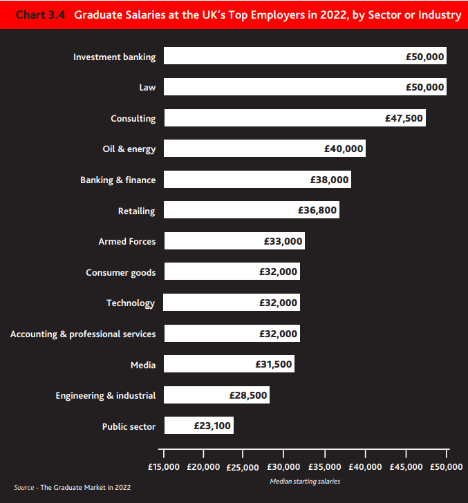 在各大行业中,以投行(Investment banking)和法律行业(Law)的起薪点最高(约为50,000英镑),排在第二位的是咨询顾问企业(Consulting),起薪大约在47,500英镑左右。此外,石油能源(Oil & energy)和银行金融业(Banking & finance)的毕业收入也是相当可观的。