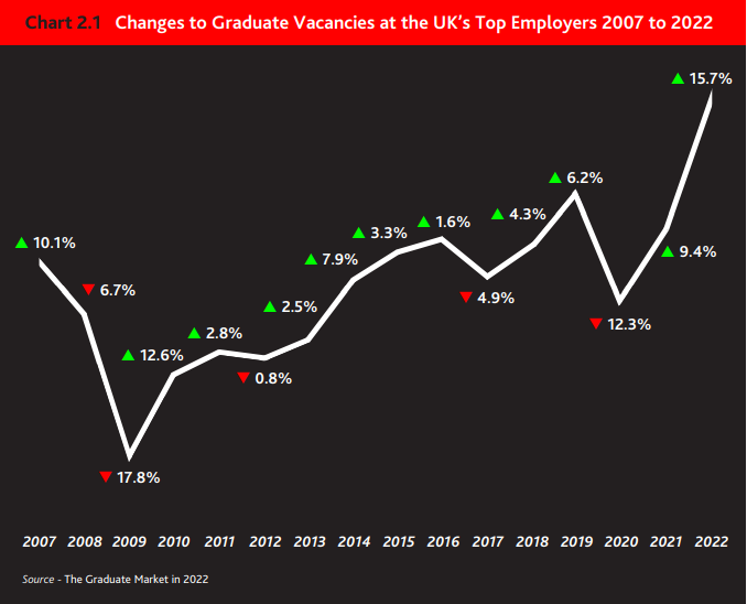该报告在开头部分,统计回顾了2007至2021年期间的毕业生职位空缺数量变化情况。根据数据显示,2021年英国百强雇主招聘的毕业生数量比2020年增长了9.4%,2022年增幅预计将达到15.7%。而在2019至2020年,由于新冠疫情的来袭,导致劳动力市场的需求出现大幅下降。