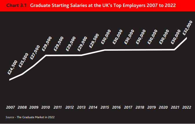 但根据报告预测分析,在接下来的2022年,毕业生起薪中位数将出现史上最大增幅,预计将达到32,000英镑,同比增长近6.6%。