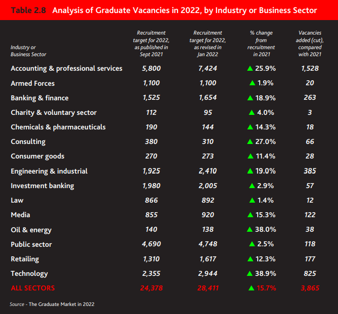 根据预测目标,会计和专业服务行业将成为2022年最大的应届毕业生招聘机构,为大学毕业生提供大约7,424个就业岗位。