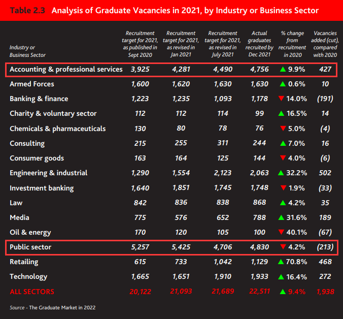 从具体行业部门来说,公共部门(Public sector)招聘毕业生数量最多,其次是会计和专业服务(Accounting & professional services)企业。