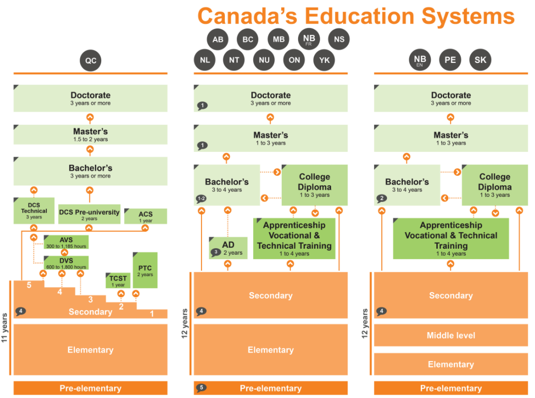 魁省是加拿大唯一采用5年制中学教育制度的省份,魁省的中学分为Sec I、Sec II、Sec III、Sec IV、Sec V五个阶段,对应7到11年级。其中,7年级和8 年级等同于初中,9至11年级等同于高中,毕业后拿到魁北克政府的中学文凭SSC(Secondary School Diploma)。