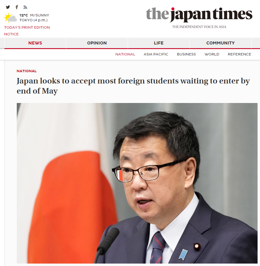 3月9日,日本官房长官松野博一举行记者会,强调将加速迎接外国留学生进入日本,以对应徘徊在国门外的15万留学生。他表示到5月底以前,将有相当数量的留学生可以进入日本。
