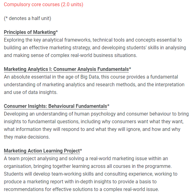 传统的市场营销核心课程主要包括:市场管理、消费者行为研究、品牌管理战略、市场调研等,有的学校会增加一些如财务、全球化管理或是组织行为学等管理学的内容,适合转专业的学生申请。以 LSE(伦敦政治经济学院)的 MSc Marketing 项目为例,消费者心理和数据分析是两大重点,核心课程具体如下: