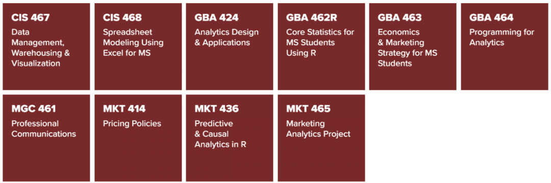 以美国 University of Rochester(罗彻斯特大学)的 MS Marketing Analytics 项目为例,其市场分析课程有很强的定量组合部分。具体核心课程如下:
