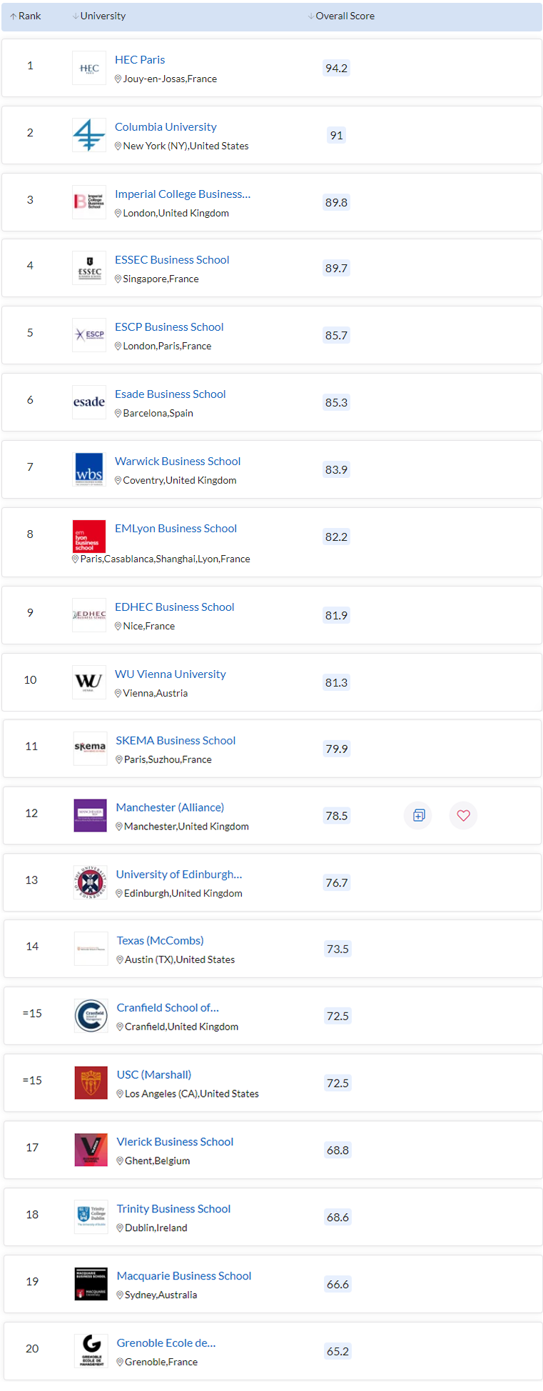 在 2022 QS 全球 Marketing 硕士排名中,前五的院校被法、英、美三国包揽。而 TOP20 的院校中,法国院校占了 7 所,且排名第一的 HEC Paris(巴黎高等商学院)也是法国的 ;英国院校占了 5 所;美国占了 3 所。
