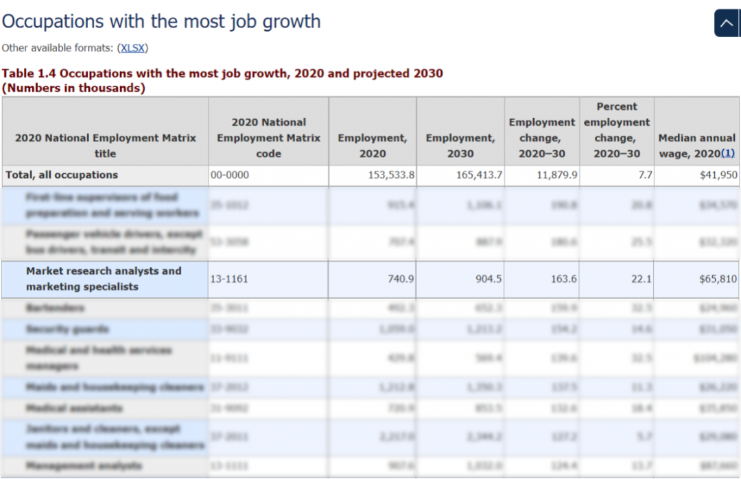 美国的市场营销偏向其国内市场的需求导向,对本土市场极为依赖。基于市场的差异性,美国营销学界的研究方向比较重视企业端资讯整合,以及内部营销策略构建。根据美国劳工统计局(U.S. Bureau of Labor Statistics)的数据,到 2030 年,全美预计新增大约 163.6 万个 Marketing 相关职位,劳动力市场需求巨大。