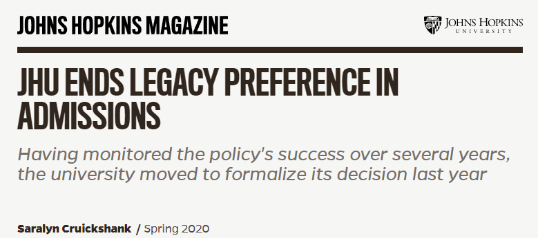 2020 年 1 月,约翰霍普金斯大学(JHU)宣布,彻底取消招生中的传承偏好。