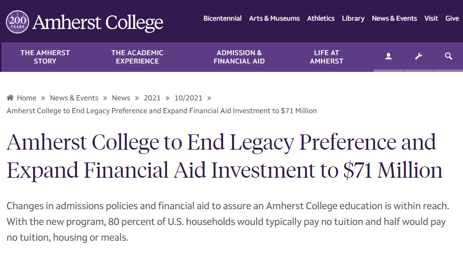 去年10月,阿默斯特学院宣布:从2022-2023申请季起,学校将取消Legacy Admission,并将每年增加7100万美元的经济援助资金,用于帮助那些来自低收入家庭的学生。