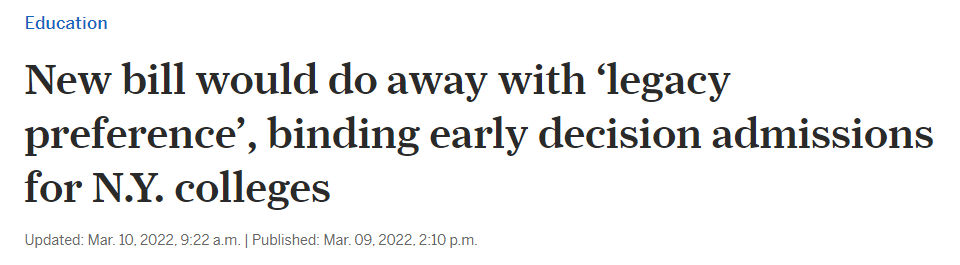 近日,美国纽约州民主党籍议员 Andrew Gounardes 和 Latrice Walker 纽约州立法机构递交了一项新法案,内容是要求禁止该州所有大学继续使用本科招生中的“Legacy Preference(传承偏好)”和“Binding Early Decision(绑定性早申)”。
