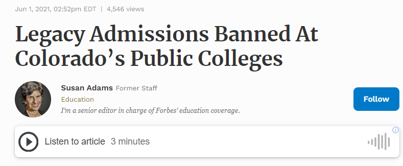 去年,科罗拉多州州长 Jared Polis 签署了一项法案,禁止州内的公立大学在本科生录取中采取“校友子女优先”的招生政策。
