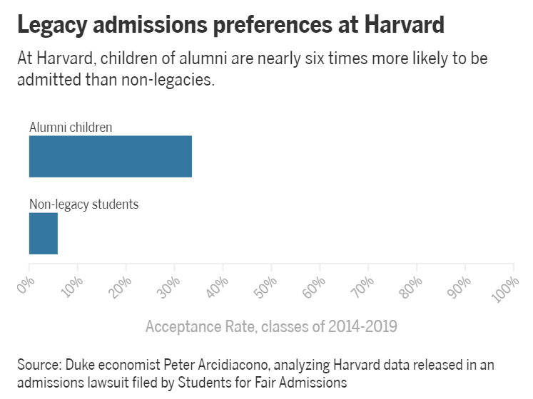在 2019 年“哈佛大学亚裔歧视案”诉讼过程中,哈佛首次公开的大量录取数据显示:在 2014-2019 届的班级中,哈佛校友子女的录取率为 33.6%,而非校友子女的录取率为 5.9%,校友子女的录取率是非校友子女的近6倍。
