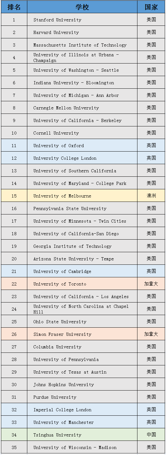 从以上榜单中我们可以看到,美国院校包揽了前十。并且在Top35的名单中,绝大部分院校均为美国大学,其次是英国,但在学校数量上还是和美国相差甚远。