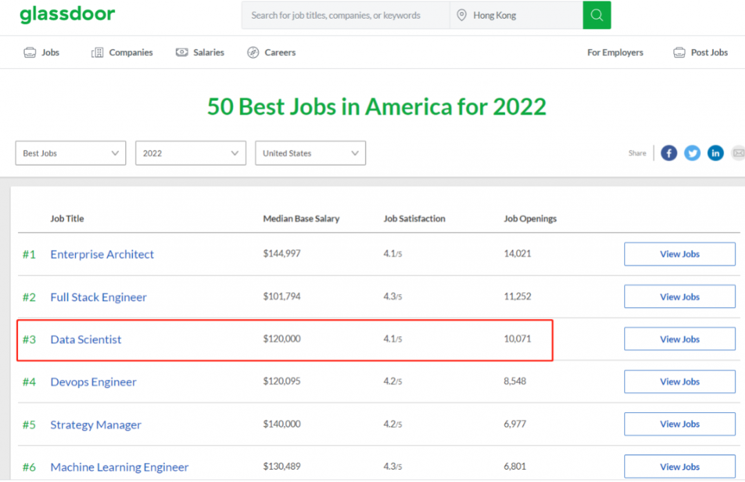 根据 Glassdoor 《 2022 美国 Top 50 最佳工种》排名显示,数据科学家以年薪中位数 $120,000(约76万人民币)位列美国最佳职业榜单的第三位,是美国最受欢迎的工作之一。