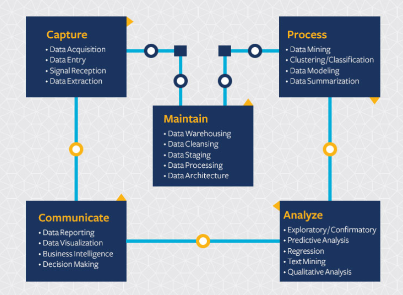 每个学校具体涉及的课程会有所不同,但是主要都围绕数据科学的五个不同阶段: