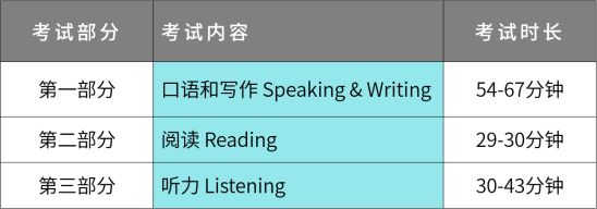 该考试测试听、说、读、写四项英语语言技能,其中:
