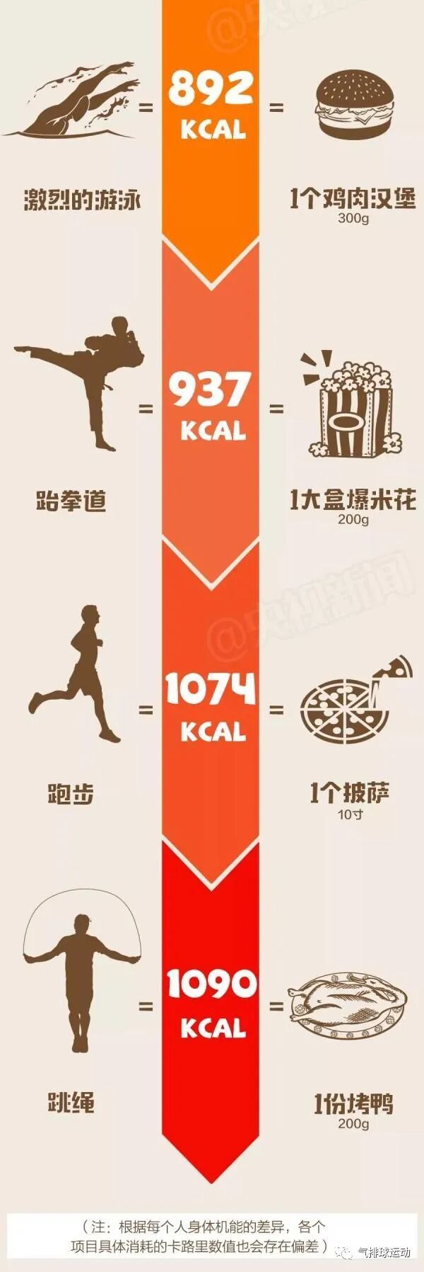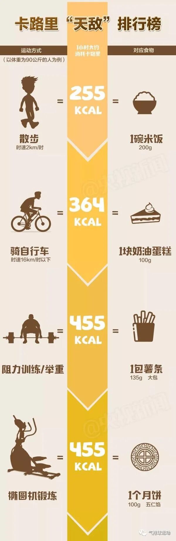 今天,为你准备了一份卡路里“天敌”排行榜,把各类运动消耗的卡路里换算成了各种熟悉的食物。对照图片快来计算一下吧!