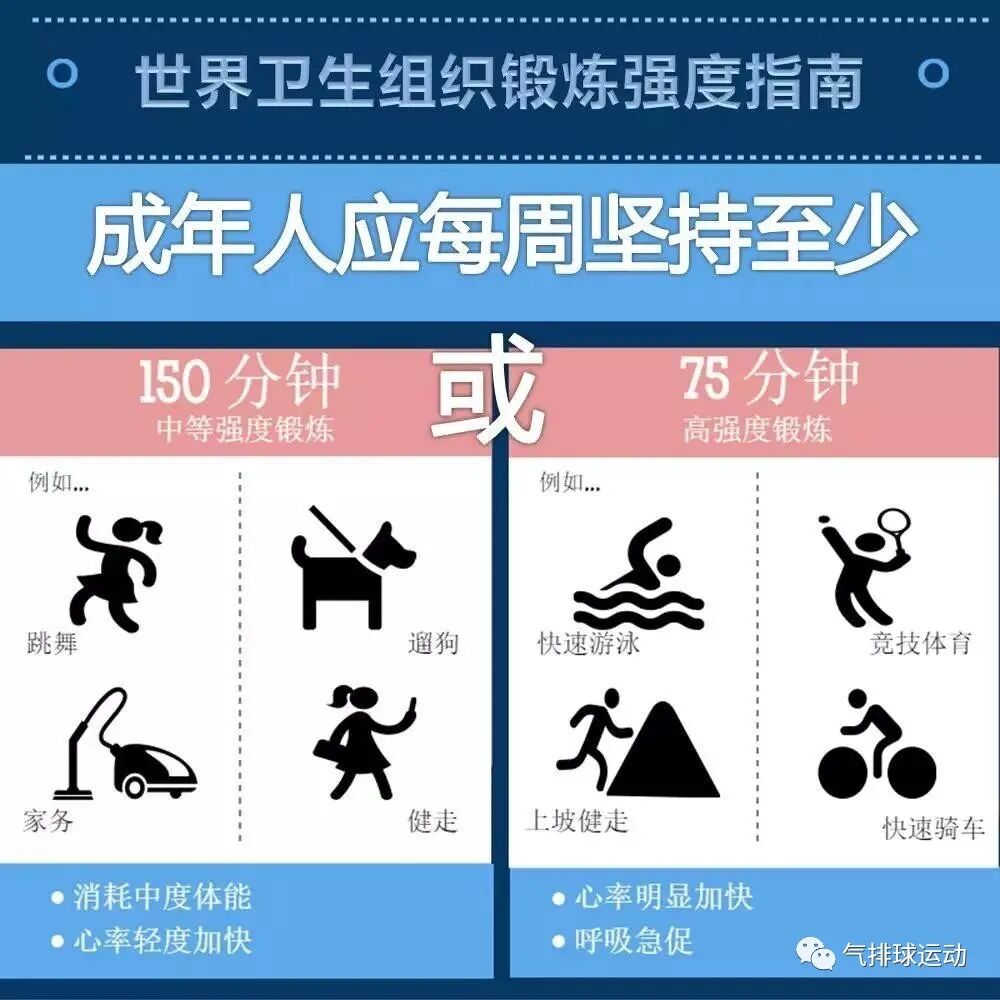世界卫生组织建议,成人最好每周至少进行150分钟的中等强度身体活动,或75分钟的高强度身体活动,低于这个标准的人即被认为是身体活动不足。