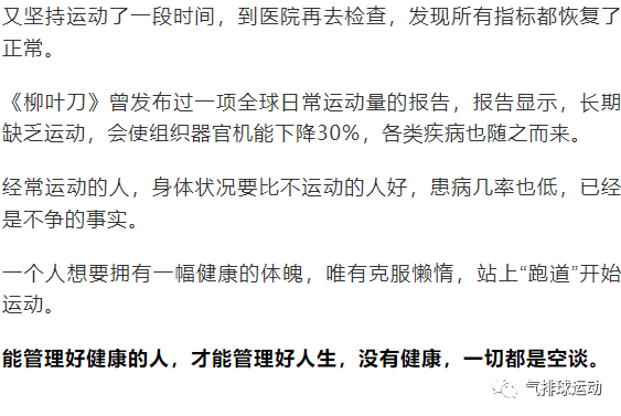 如今,这位朋友是个十足的运动狂爱好者,每周雷打不动的要到健身房锻炼5-6次,各种运动计划都在有条不紊的进行。