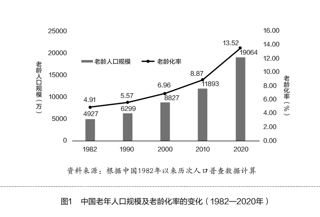 中国作为发展中人口大国,由于受生产力及经济社会发展水平的制约,人口老龄化始发相对较晚,老龄化率的上升大致始于1964年。但由于生产力及经济社会发展与人口生育控制政策的双重作用,使人口转变提前完成,人口老龄化快速发展。1982年,中国65岁及以上老年人口尚不足5千万人,老龄化率只有4.91%。2000年65岁及以上老年人口已增长到8827万人,老龄化率提高到7%,显示中国从2000年即开始进入老龄化社会(根据联合国的定义,如果一个国家或地区老龄化率达到7%称为老龄化社会,达到14%称为老龄社会,达到21%称为超老龄社会)。之后持续发展,2010年65岁及以上老年人口已超过1亿,老龄化率提高到8.9%;2020年65岁及以上老年人口进一步增长1.91亿人,老龄化率也同步提高到13.52%,距离进入老龄社会仅差不到0.5个百分点(图1)。
