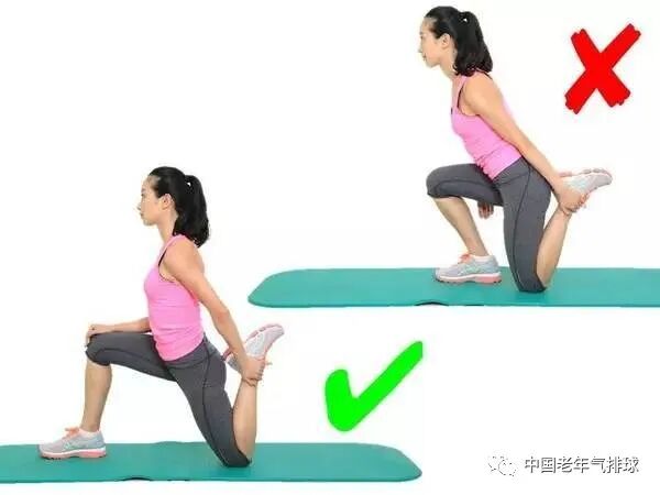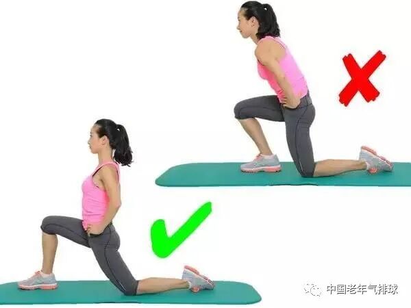 弓箭步一定要大,同时要注意腰背挺直,身体不要前倾,这样的错误既没有办法充分的拉伸到髂腰肌,对脊柱跟腰椎也不好;同时注意前腿膝盖尽量不要超过自己的脚尖,防止膝关节压力过大。