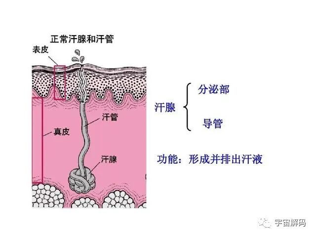 只要温度超过了30℃,人体内的汗腺就开始工作,看上去它就像盘曲成团的小管,分布在皮肤里面,表面就有细微的毛孔。