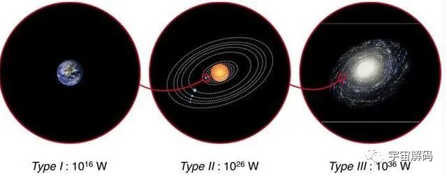 其中,I型文明为行星文明,可以使用文明所在行星上的所有可用能源,包括地下的所有能源(如化石燃料和可用于核裂变的材料),以及从恒星“播撒”到所在行星上的所有能量,能够达到这一级别的衡量标准,为所利用的总能量达到10^16 瓦。II型文明为恒星文明,可以利用所在恒星系的所有资源和能源,其中既包括对恒星所有能量输出的利用,同时也包括对恒星系统内其他行星、卫星等资源的利用。据估算,起码要达到的利用能量总规模,为10^26瓦级别。
