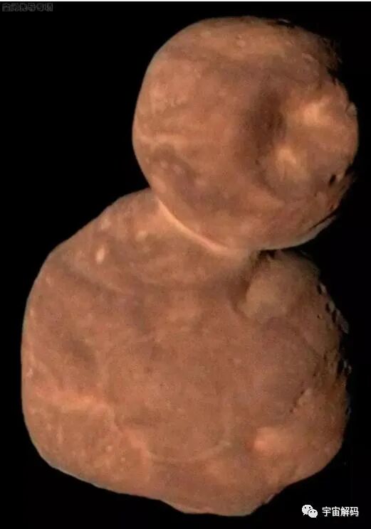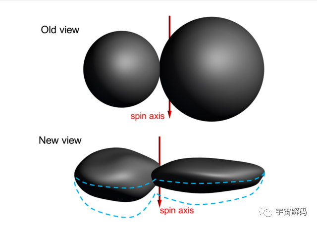 先开始观测到的图片数据显示MU69是一个像雪人一样的星体,由两个球状物体链接组成。但是就在不久后,分析完最新的数据得出来的结论却引发了轩然大波,组成MU69的两个球状物竟然是扁平的!