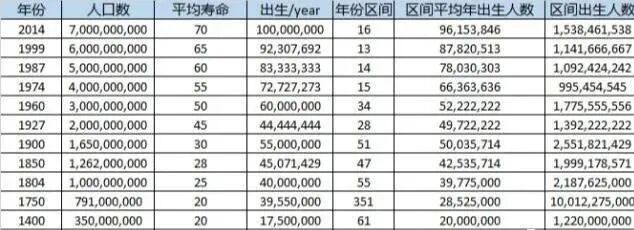 有一种结果是:看上图,从确立现代人祖先的时间开始,大约是五六万年前。此数据开始于五万年前,人类数量以100万为标准,当时人均平均寿命才15岁,出生率为6万左右;公元1年,世界人口数量达到2亿,当时人均平均寿命为20岁,区间平均出生人数为500多万;公元2014年,世界人口数量达到70亿,人均平均寿命为70岁,区间平均出生人数为9600多万。通过上班边列表,我们叠加区间人数出生人数和等于年份区间乘以区间平均年出生人数大概等于950亿 。这是截止到2014年,世界上曾存在的人口数量为950亿。