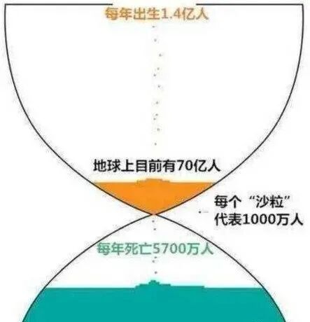 还有一种结果是:看上图,是个沙漏上面是活着的人,用棕色表示;下面是死去的人,用绿色表示;每个“沙粒”代表1000万人,现在每年出生人口数量为1.4亿,每年死亡人数为5700万,估计地球上曾有1080亿人生活过,而存活的人数为70亿,死亡加存活的人数总和为1080亿人。这也是截止到2014年,世界上曾存在的人口数量约为1080亿。