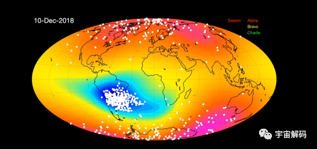 相关的调查后来在ESA的蜂群探测检测到了地球磁场减弱,从非洲延伸到南美洲。磁场变化并不是想象中的静态变化,而是在强度和方向上都有,此前的北极磁区已经说明了这一点。